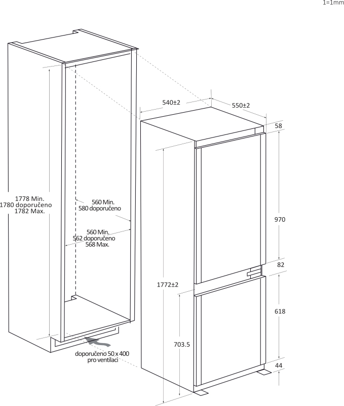 Vestavná kombinovaná chladnička No Frost; Energetická třída E; Celkový čistý objem 251 litrů; Elektronická regulace teploty; Montážní konzole pro vestavbu; Roční spotřeba energie: 229 kWh; Doba skladování při výpadku proudu: 8 hodin; Hladina hluku: 35 dB (A); Rozměry (VxŠxH): 177,2 x 54,0 x 55,0 cm; Hmotnost: 57 kg.