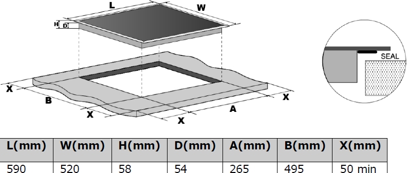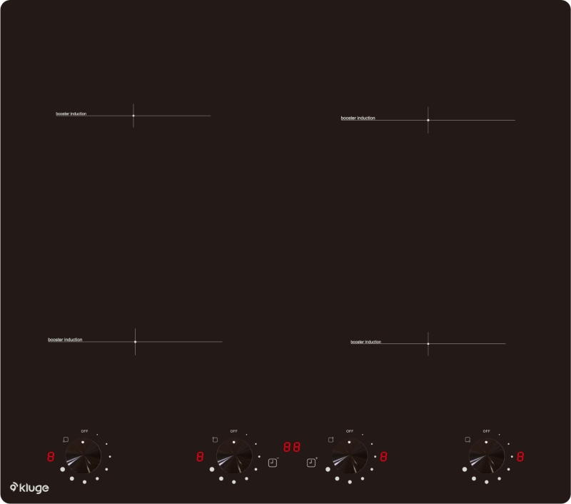 Indukční varná deska šířky 60 cm; Povrch z černého skla s s rovnými hranami; Ovládání pomocí otočných voličů; 8 stupňů nastavení výkonu; 4 nezávislé varné zóny: levá přední 18 cm / 2,0 kW, levá zadní 16 cm / 1,5 kW, pravá přední 16 cm / 1,5 kW, pravá zadní 18 cm / 2,0 kW; Celkový příkon 7,0 kW; Detekce nádobí; Automatická ochrana vypnutím; Indikace zbytkového tepla; Časovač pro automatické vypnutí, nebo pro použití jako minutka; Rozměry (VxŠxH): 58 x 59 x 52 cm