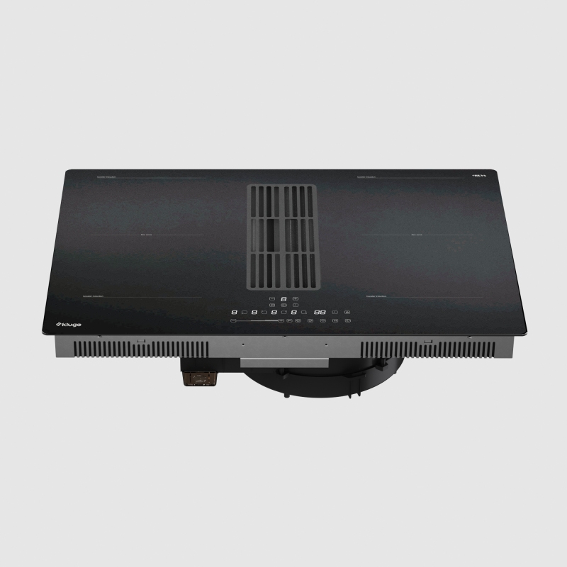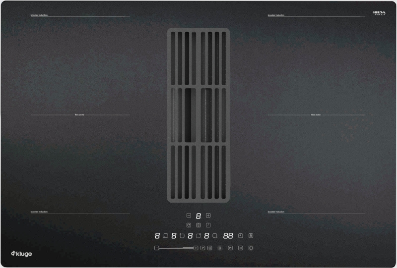 Indukční varná deska s integrovaným odsavačem par, šířka 80 cm; Povrch z matného černého skla s bílým LED podsvícením; Dotykové ovládání Mono Slider Control; 9 stupňů nastavení výkonu varných zón včetně Boost; 4 varné zóny: přední levá a pravá 190×190 mm / 1,5–2,0 kW, zadní levá a pravá 190×190 mm / 2,0–2,8 kW; 2x Flexi zóna; Integrovaný odsavač s BLDC motorem 170 W; Max. výkon odtahu: 593 m³/h; Hlučnost 78 dB(A); 3 funkce vaření a funkce Smart pause – snížení výkonu všech zapnutých zón; Časovač s možností nastavení až do 99 minut; Upozornění na zbytkové teplo a dětský zámek; Detekce nádobí a automatická ochrana vypnutí; Celkový příkon: 7,57 kW; Rozměry (V׊×H): 20 × 77 × 52 cm.