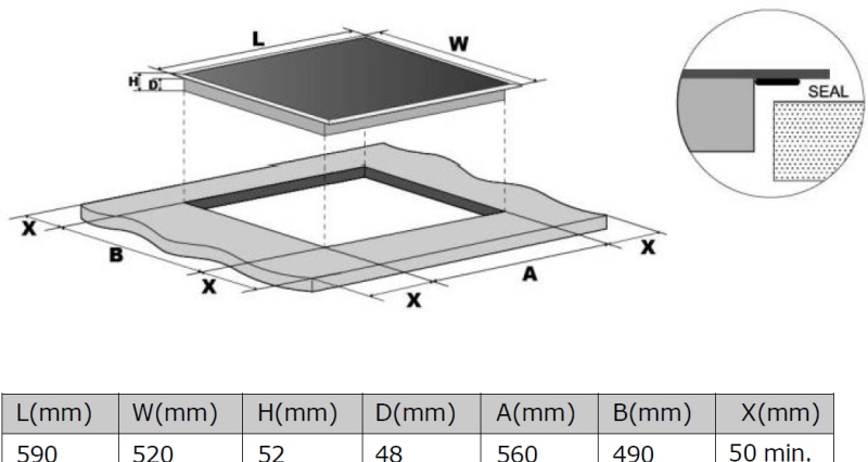 | Rozměry spotřebiče nad pracovní deskou (V x Š x H): | 59 x 52 |