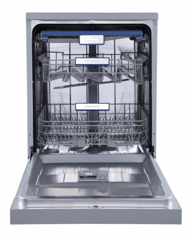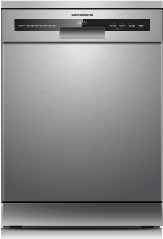 Myčka nádobí Heinner HDW-FSM60714AWD+++, Extra náplň - 14 sad nádobí, energetická třída D, automatické otevírání dvířek, elektronické ovládání, LED displej, 7 mycích programů, rychlý program 30’, automatický Smart program: 55°C - 65°C, hloubkové čištění - program Hygiene 70°C, 1hodinový program, intenzivní program 65°C, možnost odloženého startu (1-24H), možnost poloviční náplně - duální zóna, funkce silného mytí, funkce extra sušení, 3 koše - horní koš na příbory, flexibilní prostor - nastavitelný horní koš (naložený), spodní koš: 4 skládací držáky na talíře, dětská pojistka, ochrana proti poškození vodou - Aquastop, spotřeba vody: 10 l/mycí cyklus, rozměry (ŠxHxV): 60 x 60 x 85 cm, barva: NEREZ