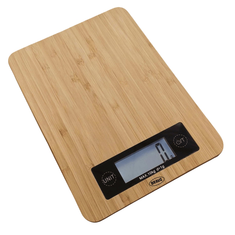 Kvalitní úsporná digitální kuchyňská váha Bravo B-5000 s kvalitním bambusovým povrchem potěší svou jednoduchostí. Nožičky váhy jsou proti klouzání opatřeny gumovým povrchem. Váha se ovládá velmi jednoduše - dotykově. Po zapnutí se automaticky zkalibruje. Lze postupně kalibrovat váhu v průběhu vážení a tím podporuje funkci postupného dovažování. Jednotkou vážení jsou gramy, ml, lze však přepnout i na anglické jednotky. Váha se samozřejmě sama po delší nečinnosti vypne, aby šetřila baterii, pokud ji chcete vypnout okamžitě, postačí dlouze podržet prst na zapínací oblasti. Ať už hledáte originální dárek nebo pouze krásnou váhu do Vaší kuchyně, jistě Vás tato váha nezklame.