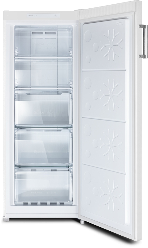 Vnitřní objem 166 litrů je rozdělen do 3 standardních zásuvek a 2 horních přihrádek s výklopným čelem, což zajišťuje přehledné uspořádání uložených potravin. K dispozici jsou funkce Super mrazení a Super chlazení pro rychlé dosažení požadované teploty. Bezpečnost a spolehlivost provozu zvyšují dětský zámek, alarm otevřených dveří, alarm překročení teploty a poruchy a paměť při výpadku napájení.