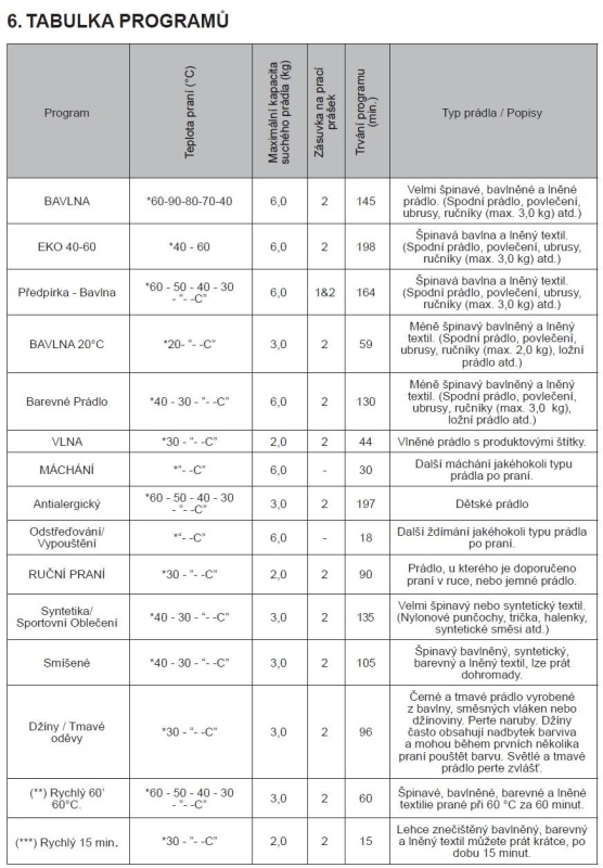 | Programy praní: | Bavlna, Bavlna s předpírkou, Vlna, Ruční praní, Máchání, Bavlna 20°, Odstředění + vypouštění, Antialergický, Džíny / Tmavé oděvy, Rychlý 60’, Barevné prádlo, Eco 40-60, Rychlý 15’, Mix, Sportovní |