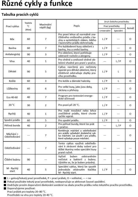 | Programy praní: | Vlna, Bavlna, Lůžkoviny, Antialergický, Eko 40-60, Košile, Odstřeďování, Spodní prádlo, Peří, Dětské, Rychlý, Máchání + odstředění, Čištění bubnu, Mix, 20 °C |