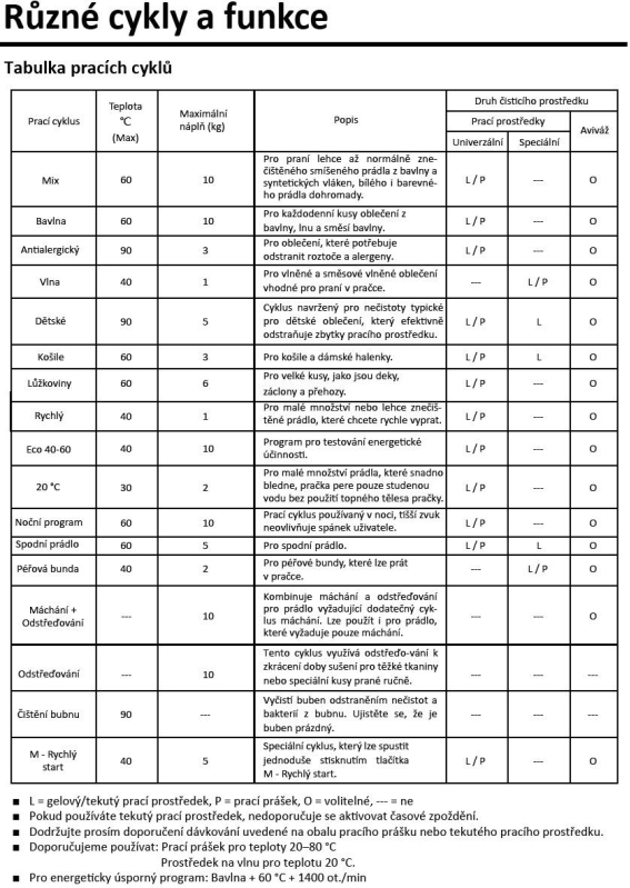 | Programy praní: | Bavlna, Vlna, Košile, Odstřeďování, Noční praní, Spodní prádlo, Dětské, Rychlý, Máchání + odstředění, Čištění bubnu, Lůžkoviny, Antialergický, Eco 40-60, Mix, 20 °C, Péřová bunda |